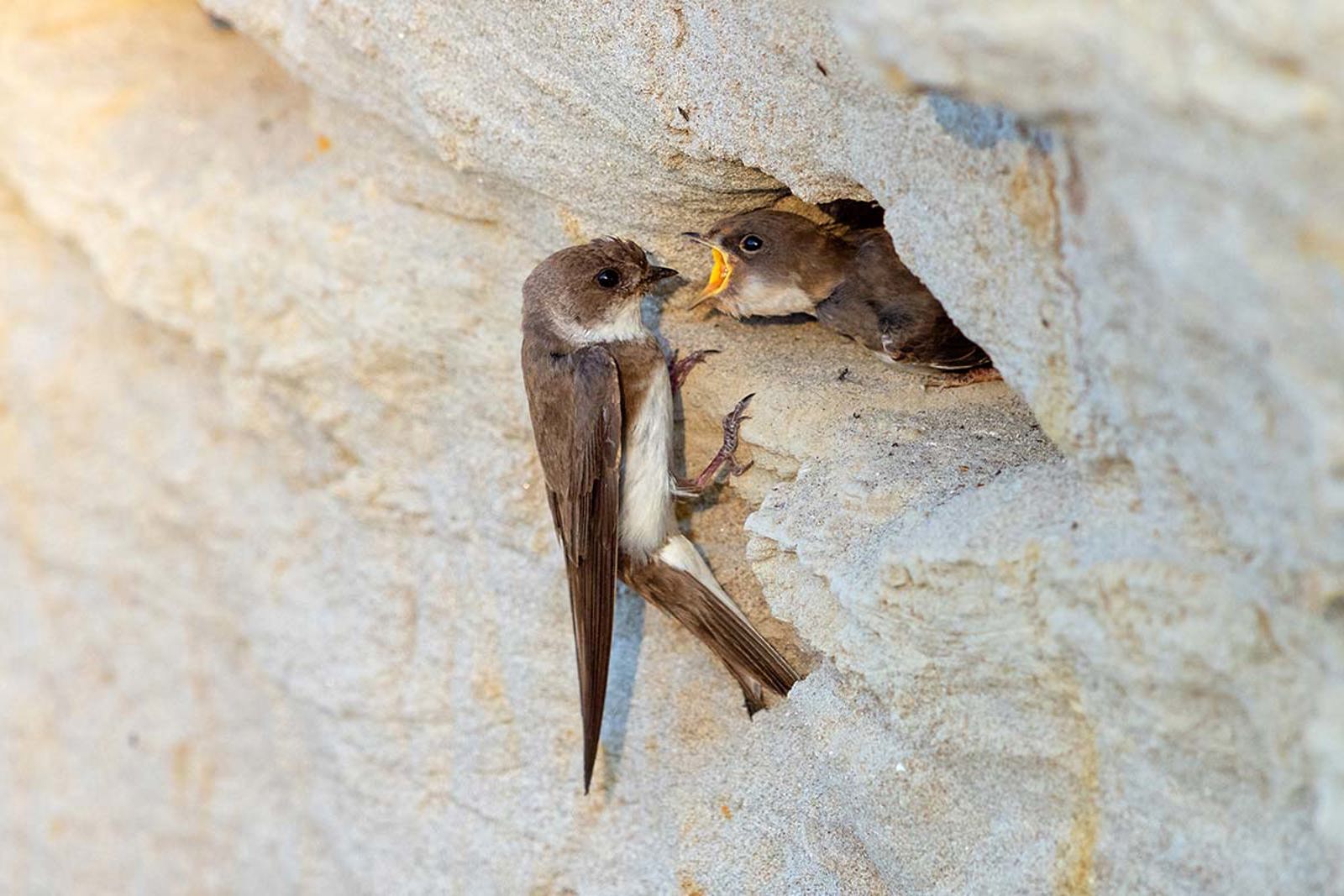 Mitte April ist es soweit: Dann kehren die Uferschwalben aus ihrem Winterquartier zurück, suchen nach geeigneten Brutplätzen und erfüllen die Luft mit ihren raspelnden Rufen. Ursprünglich brüteten die Vögel entlang der Gewässer im Mittelland, wo natürliche Erosion regelmässig frische Sandlinsen in steilen Uferwänden freilegte. Im Sand gruben die Vögel mit ihren Füssen etwa 70 Zentimeter tiefe Brutröhren, an deren Ende sie eine mit Gräsern und Wurzeln gepolsterte Nistkammer anlegten.